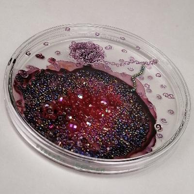 Más informaciónPilar Pedroza. Conteo Bacteriano 2. Caja de Petri, tinta para vidrio, pedrería, cerezas de plástico, lentejuela y resina.