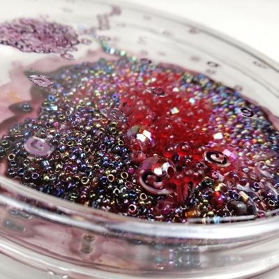 Pilar Pedroza. Conteo Bacteriano 2. Caja de Petri, tinta para vidrio, pedrería, cerezas de plástico, lentejuela y resina.