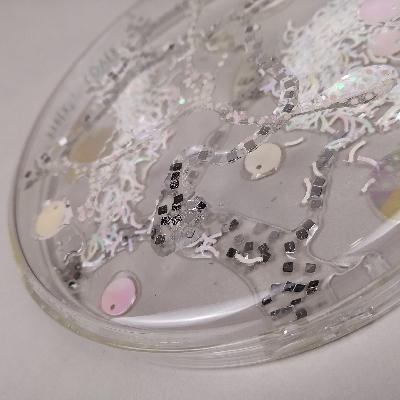 Pilar Pedroza. Desintegración. Cajas de Petri, lentejuela, confeti, alambre y resina.