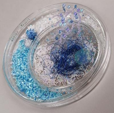 Pilar Pedroza. Campo Electromagnético. Cajas de Petri, lentejuela, confeti, brillantina, hilo, pedrería y resina.