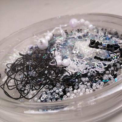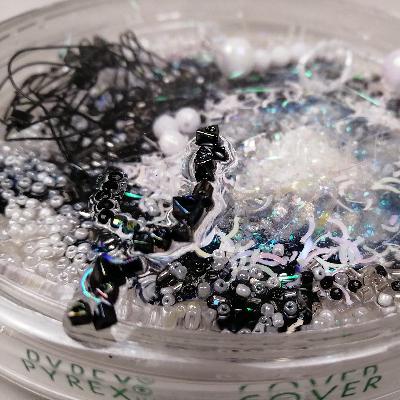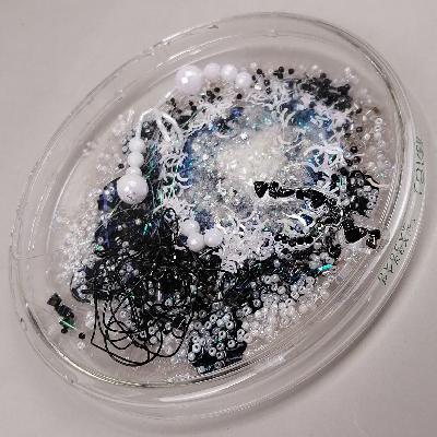 Pilar Pedroza. Cultivo de Materia Oscura. Caja de Petri, brillantina, serpentina, lentejuela, pedrería, alambre y resina.