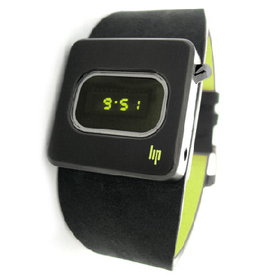 Reloj LIP Diode Green 1973. Movimiento de cuarzo. Caja cuadrada de 35 x 35 mm. en acero negro con pantalla digital de diodos verdes. Pulso en piel negra.