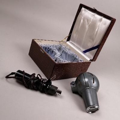 Lámpara oftalmológica. Alemania, años 50. Estructura de metal laqueado. Con mango desmontable y estuche de madera con acabado piel de cocodrilo.