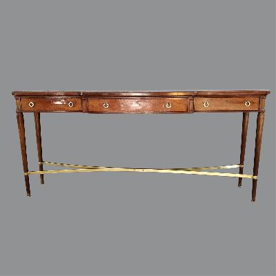 Consola de 3 cajones aparentes. México, años 60. Madera de cedro rojo. Cubierta rectangular con acabado serpenteado, 3 cajones con tiradores anillados y soportes cónicos con chambrana de bronce.