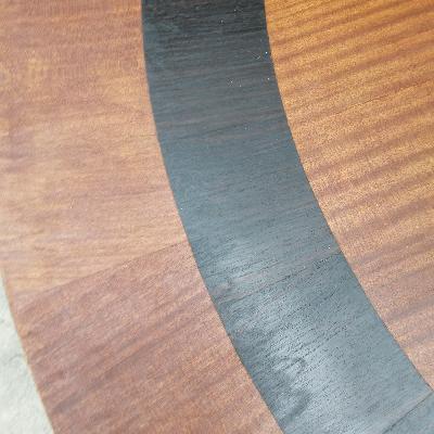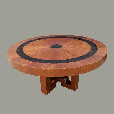 Mesa de comedor estilo Brutalista. México, años 70. Madera enchapada de cedro y ébano. Cubierta redonda con diseño concéntrico sobre soportes de grecas.