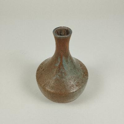 Florero elaborado en cerámica de alta temperatura color café con sobretono gris. Diseño con boca angosta