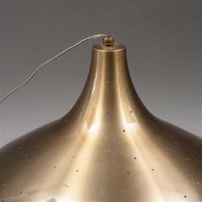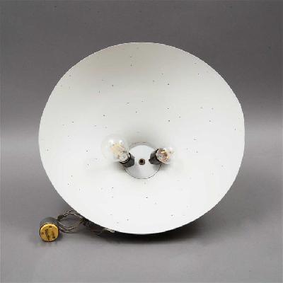 Lámpara de techo. Latón con interior laqueado blanco. Para 2 luces. Diseño en forma de campana con perforaciones.