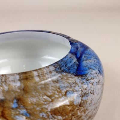 Cenicero. Italia, años 70. Cristal de Murano azul, blanco y ocre. Diseño redondo.