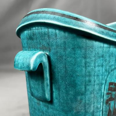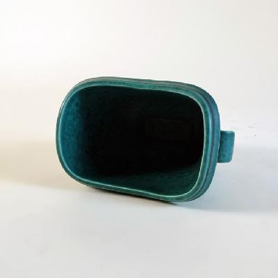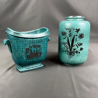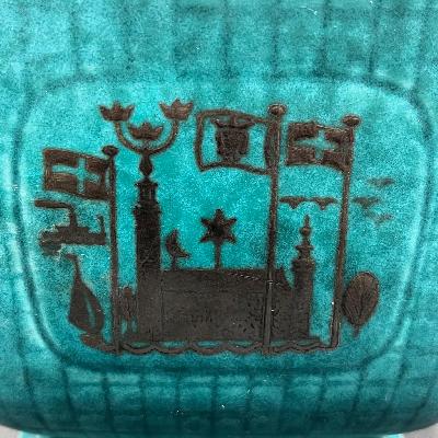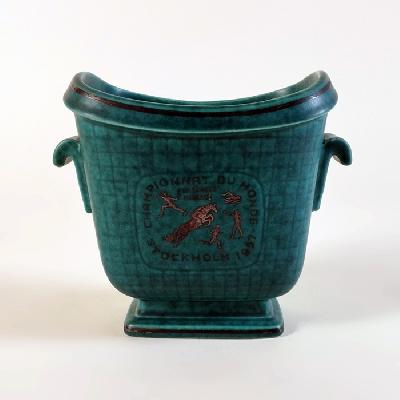 Florero de la Línea Argenta. Suecia, años 50. Edición especial para el Campeonato Mundial de Pentatlón Moderno Estocolmo 1957. Cerámica gres color verde. Diseño en forma de copa con 2 asas, relieve cuadriculado e incrustaciones de plata. En adverso, escudo alusivo al evento deportivo, al reverso representación del edificio del Ayuntamiento de Estocolmo. Sellado en base.