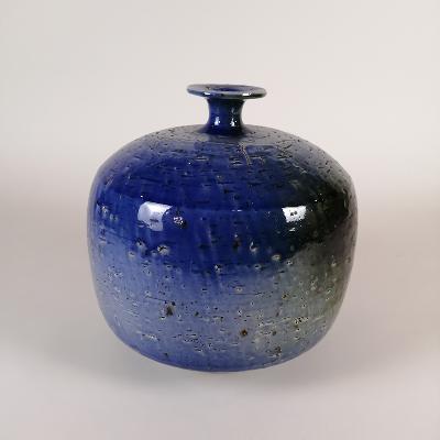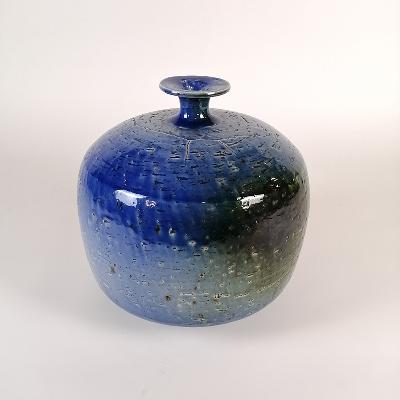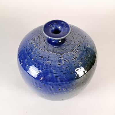 Florero. Cerámica de alta temperatura color azul. Diseño abombado con boca angosta anillada.