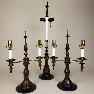 Juego de 3 lámparas, años 60. Madera tallada de caoba. Para 2 luces cada una. Diseño con fuste y brazos mixtilíneos.
