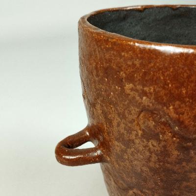 María Teresa Espriu. Jarrón. Cerámica de alta temperatura café. Diseño cilíndrico con dos asas lateral muy pequeñas.