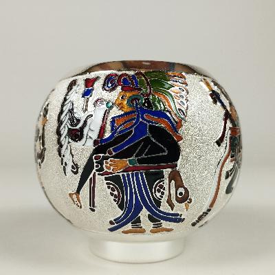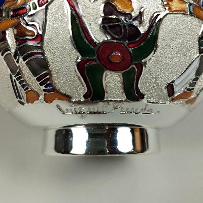 Más informaciónDepósito, años 80. Metal plateado y esmaltado con decoración a manera de figuras mayas.