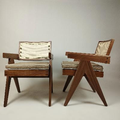 Par de sillas estilo Pierre Jeanneret. Madera de tzalam. Respaldos y asientos en palma tejida sobre soportes tipo tijera. Incluye cojín.