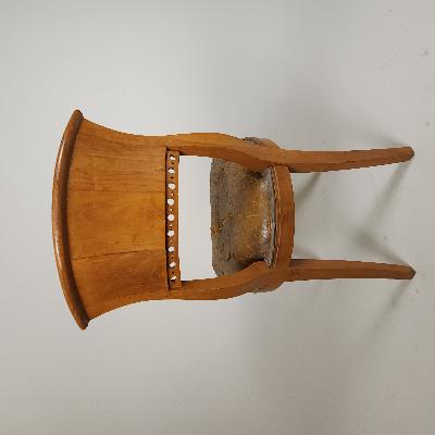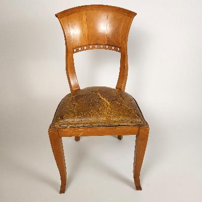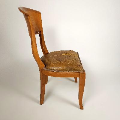 Más informaciónPar de sillas. Madera de encino. Respaldos curvos calados, asientos en piel y soportes tipo sable.