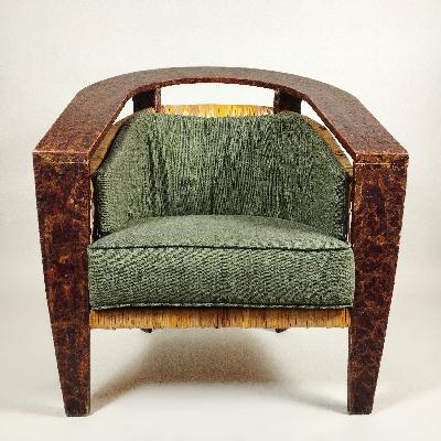 Más informaciónPar de sillones, años 70. Madera enchapada con acabado texturizado. Diseño de herradura con tapicería verde y aplicaciones de bejuco.