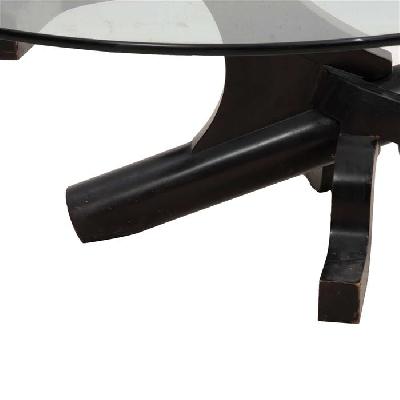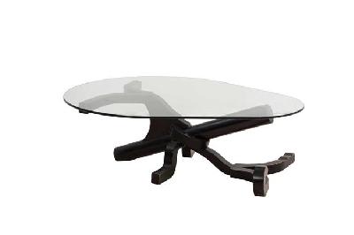 Mesa de centro elaborada en madera laqueada color negro. Diseño geométrico irregular. Con cubierta de vidrio en forma de gota.
